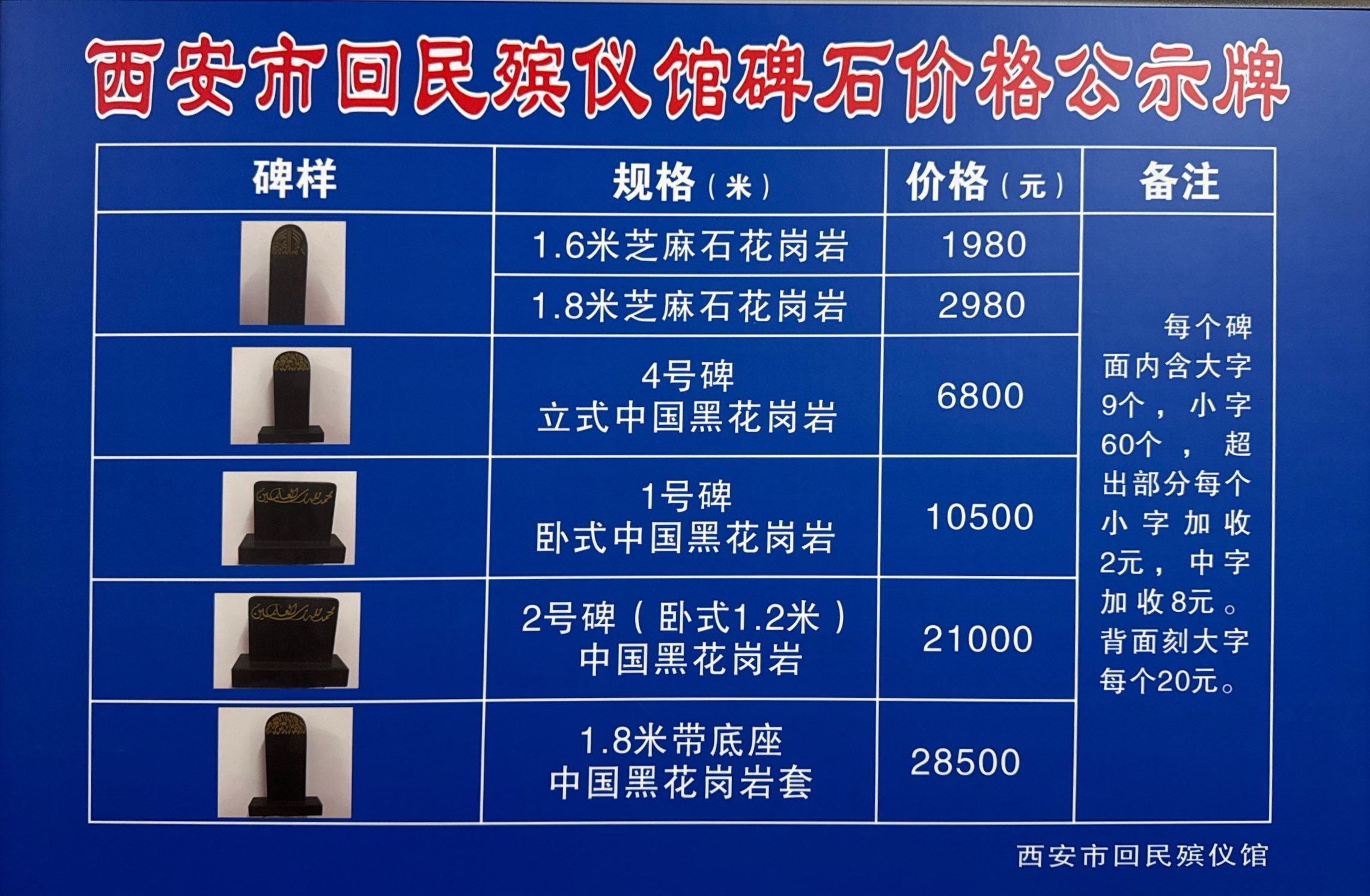 石碑价格公示: